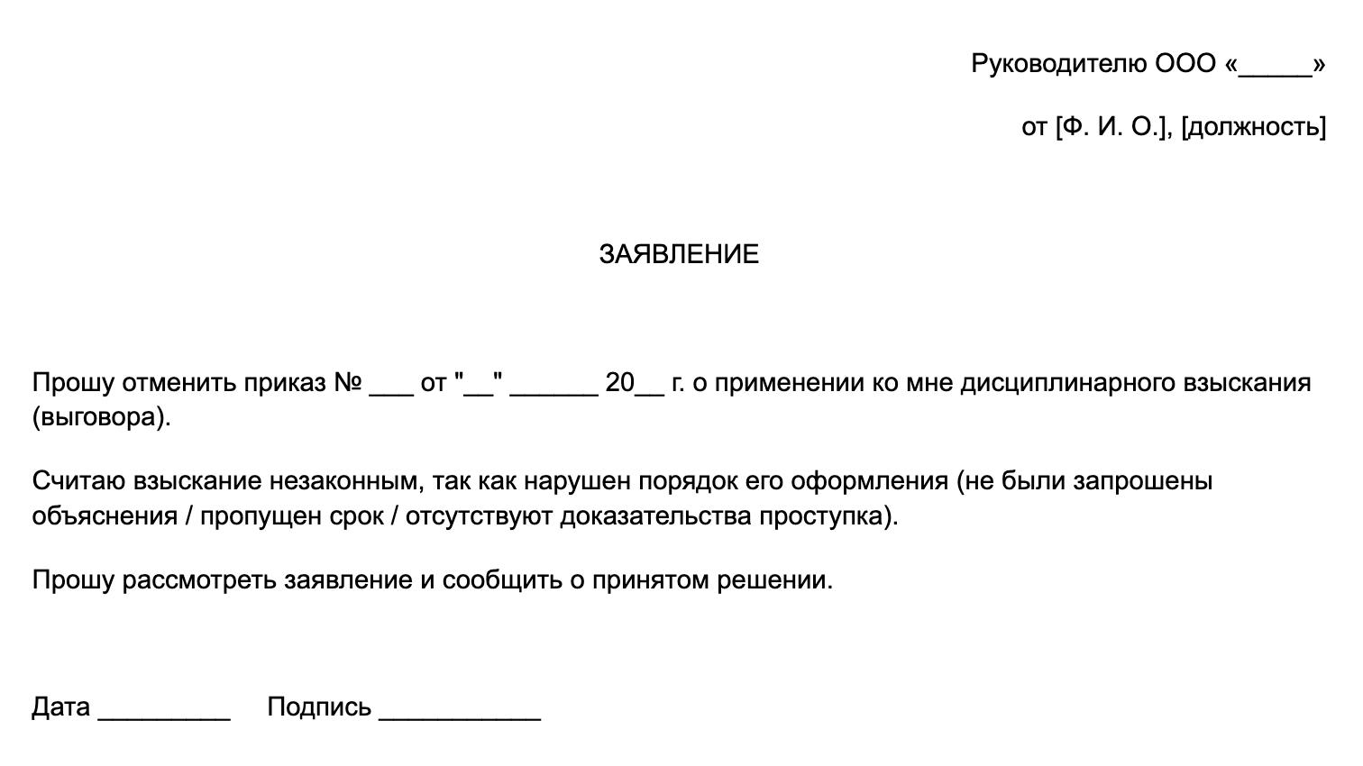 - Нет приказа или даты. Приказ о взыскании должен быть письменным, с указанием причины и даты. Без него выговор незаконен.