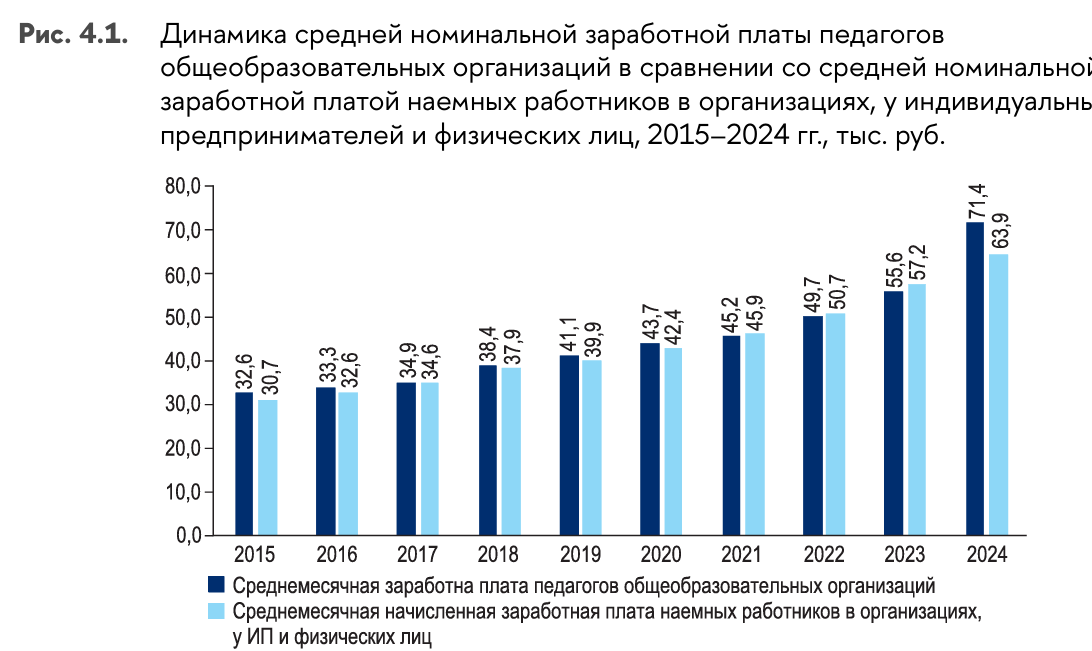- По данным Росстата, средняя зарплата учителей по стране в 2024 году составила 71,4 тысячи рублей. По данным платформы hh.ru, в первом полугодии 2025-го в вакансиях работодатели предлагали учителям в среднем 54,4 тысячи рублей в месяц.