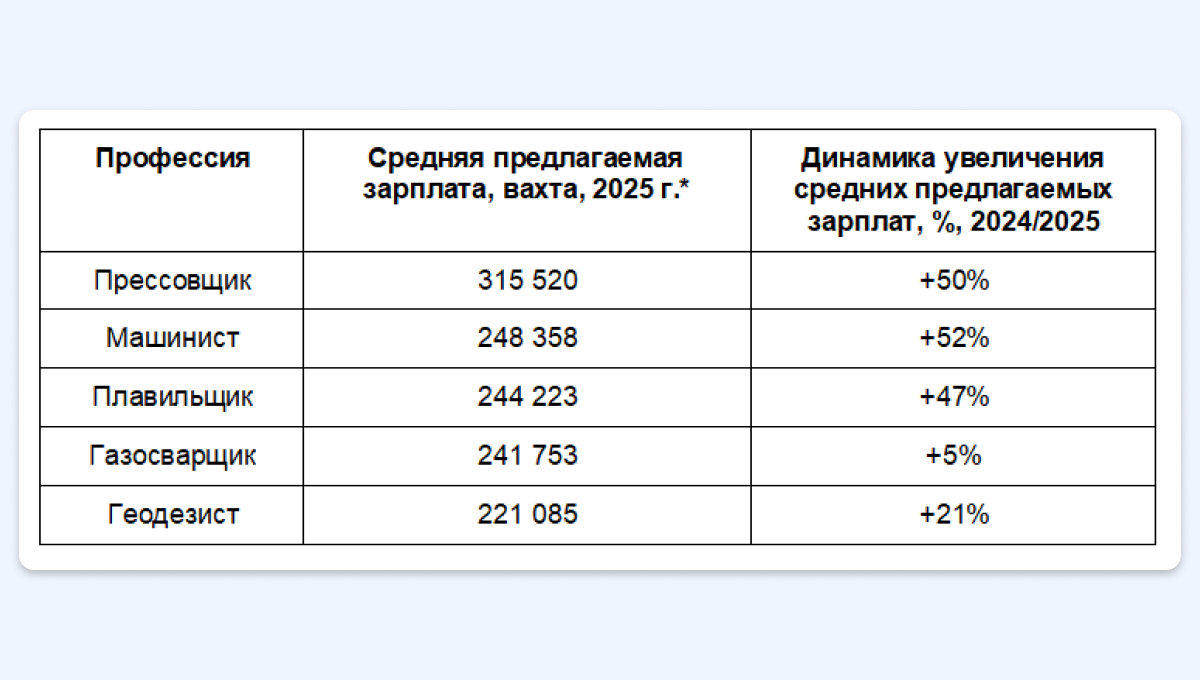 Директор категории «Рабочие и линейные профессии» «Авито Работы» Андрей Кучеренков отметил, что в 2025 году наблюдался устойчивый рост зарплат среди специалистов вахтовой занятости. В среднем зарплатные предложения на вахте выросли на 11% и достигли 154 378 рублей в месяц.