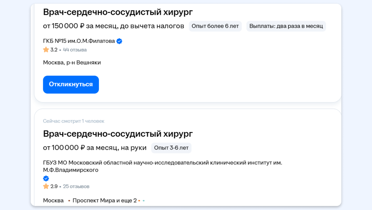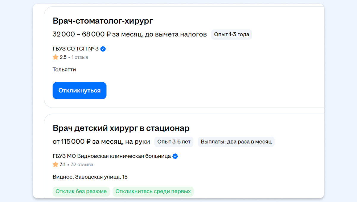 В государственных больницах стартовые предложения для врачей без опыта — 35–50 тысяч рублей. По мере роста стажа доход увеличивается и в среднем достигает 100 тысяч рублей в месяц.