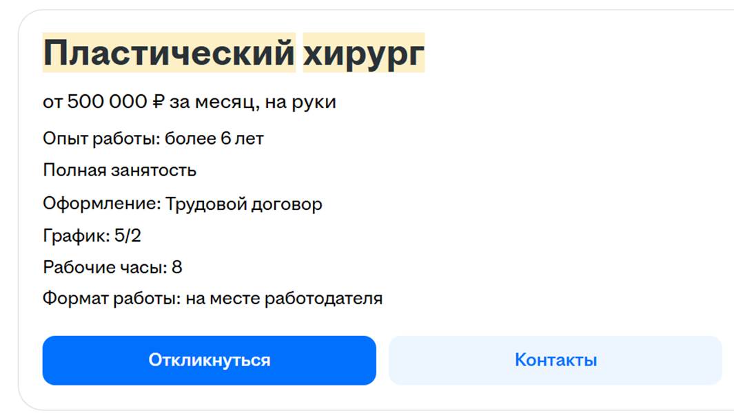 Самые высокие доходы — у пластических хирургов. В частных клиниках их заработок может превышать 300 тысяч рублей, в государственных — составлять 100–150 тысяч.